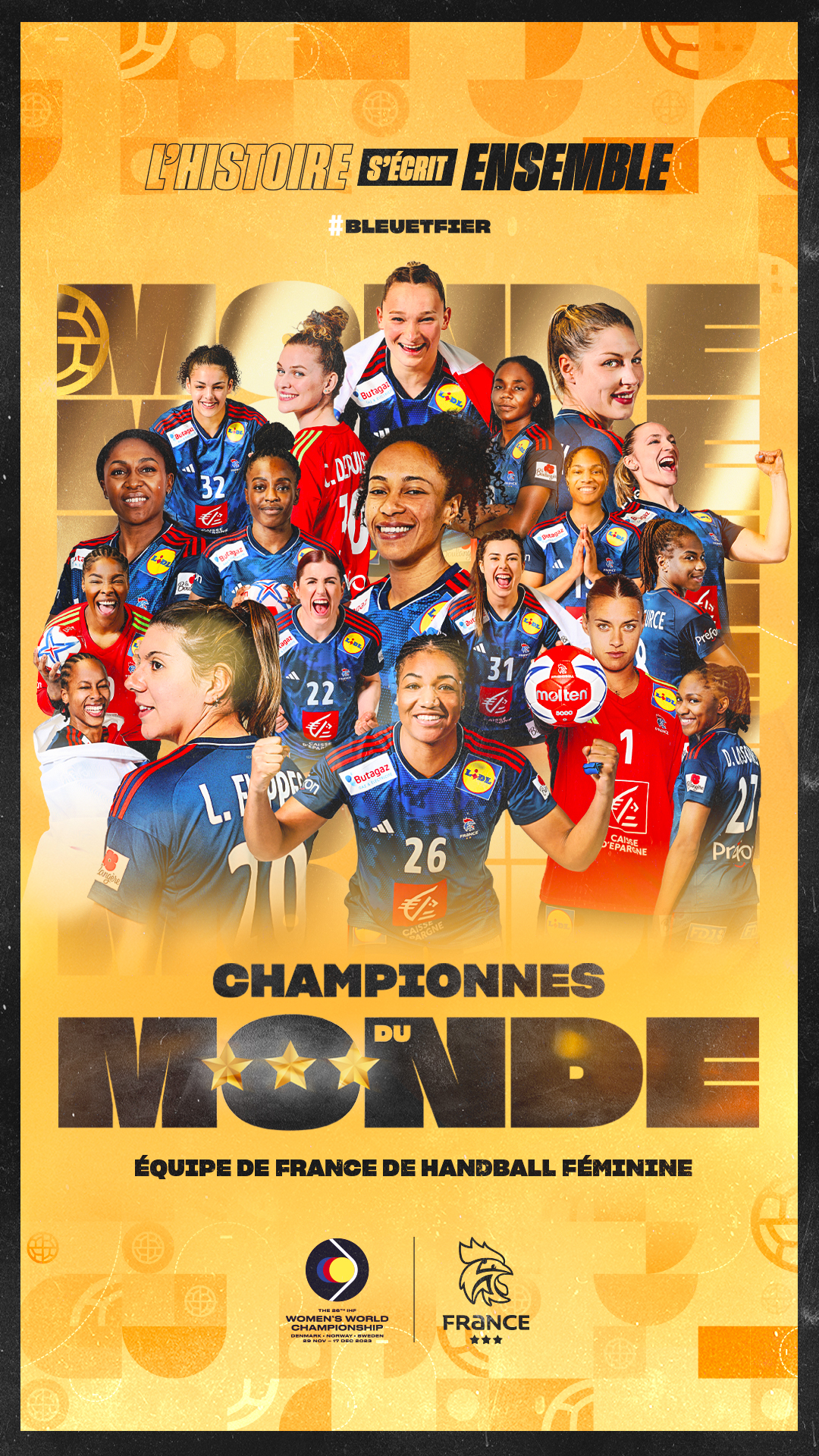 Dimanche 17 décembre 2023, à Herning, l’Équipe de France féminine est devenue championne du monde pour la troisième fois de son histoire en dominant la Norvège en finale (31-28) !